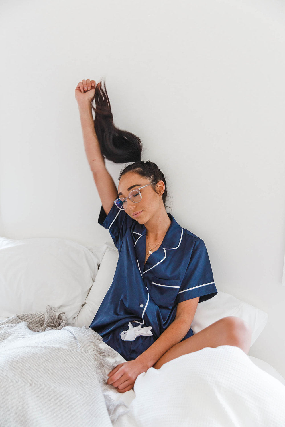 This soft luxe set features a collared button down shirt and ribbon-tied shorts with ivory piping detail.